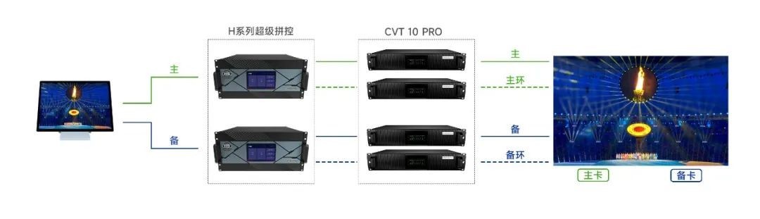 通过双机4重备份保证现场画面显示万无一失。使用2套系统同时连接显示屏,双通道同时输出信号,4张发送卡连接箱体主、备接收卡建立信号回路,任意环节故障,立即按照优先级迅速替换备份信号,整个切换时间控制在微秒级别,确保显示屏在显示上不会出现任何异常现象。